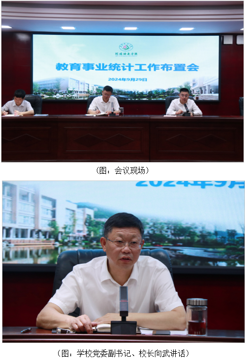 【本网讯】为推动我校教育事业统计工作顺利开展,确保统计工作的科学性、准确性、时效性和高效性,9月29日16:30,我校于行政楼二楼会议室召开教育事业统计工作布置会,党委副书记、校长向武,党委副书记毛英,发展规划处处长吴文权,相关职能部门及二级学院教师参加会议。此次会议由吴文权主持。